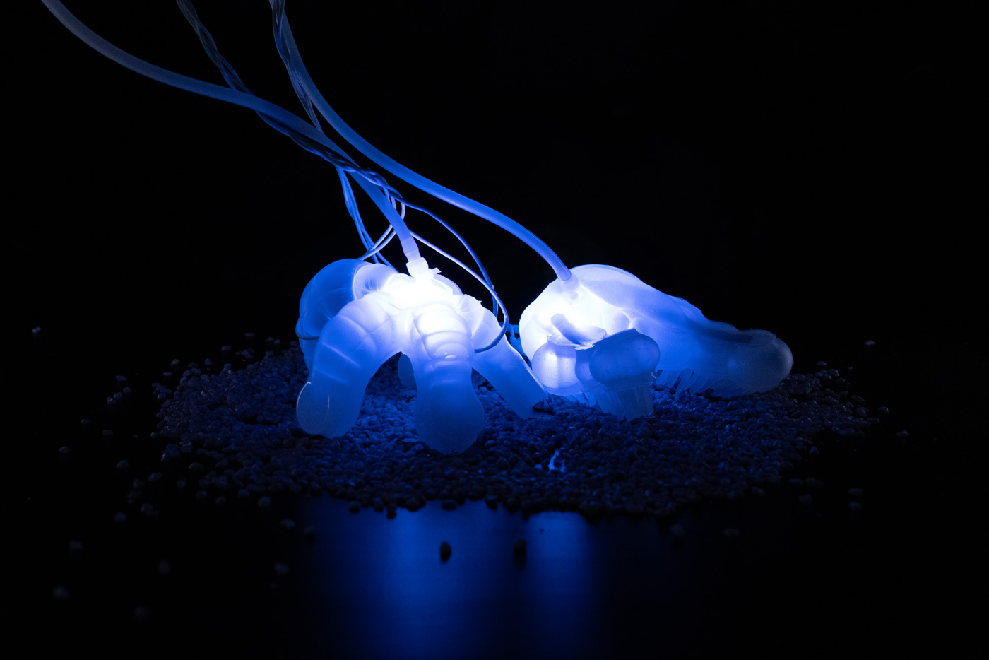 The station consists of a disc hanging from the ceiling (or floating on the water) where all the electronics are stationed; and two types of silicone inflatables/actuators connected with silicone tubing and wires for single LEDs.