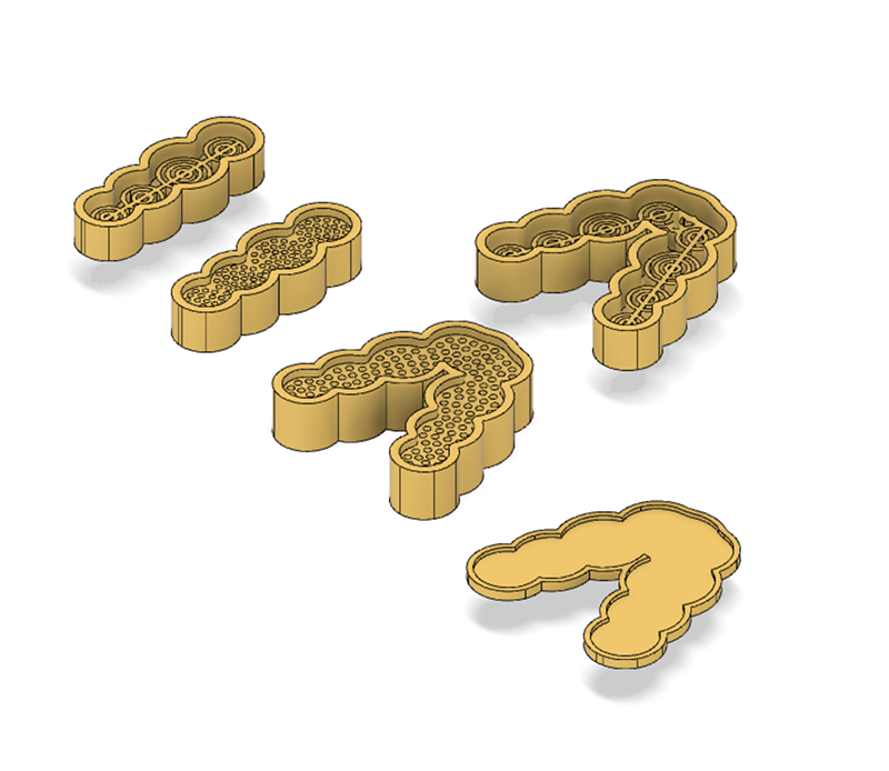 The two-piece bottom system of the algae model allowed the creation of nice fringes – when pouring the silicone, the two are loosely fit to let the air out, and when the holes are filled with the rubber, the two pieces are locked together.